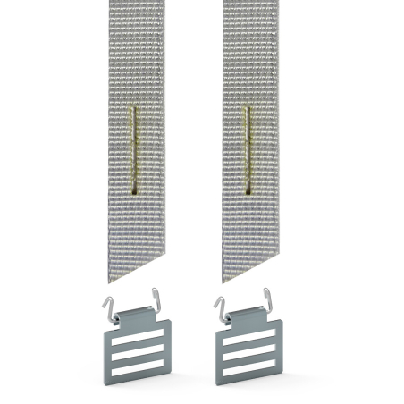 Accroche tablier volet roulant composée d'une agrafe et d'une sangle.