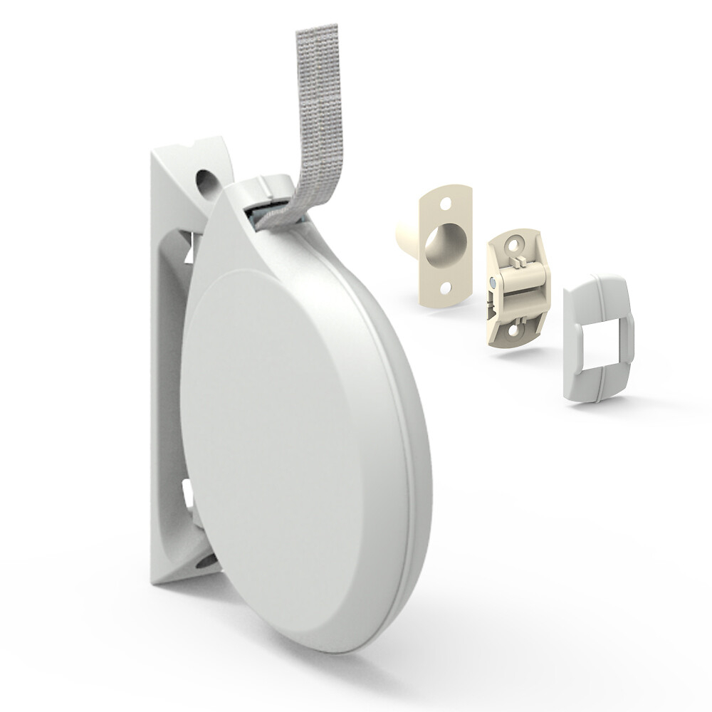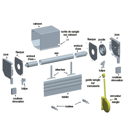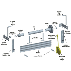 Enrouleur de sangle blanc rond, équipé d'une sangle grise de 5,5 m de longueur et 14 mm de largeur, fourni avec son guide vertical blanc.